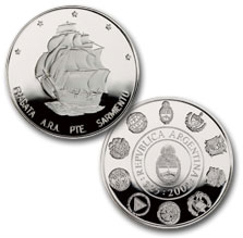 El anverso de la moneda representa la Fragata Presidente Sarmiento, bautizada con ese nombre en homenaje y gratitud al fundador de la Escuela Naval. Fue botada el 31 de Agosto de 1897 cumpliendo las pruebas de mar en mayo de 1898. A partir de 1899 prestó servicios como Buque Escuela. En 1961 se convirtió en Buque Museo de la Armada Argentina, siendo finalmente declarada Monumento Histórico Nacional.
