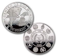 En el anverso, como fondo de la moneda se representa el continente Sudamericano, resaltando la mediterraneidad del Paraguay y la importancia de su Río Paraguay. Aparece también representada una carabela representando a la MADRE ESPAñA, meciéndose en las aguas del Océano Atlántico, merced al vigoroso VIENTO simbólicamente representado entre las nubes. En el lado opuesto se aparece un grupo representante auténtico de la familia GUARANI, en su canoa construida con corteza de árbol.