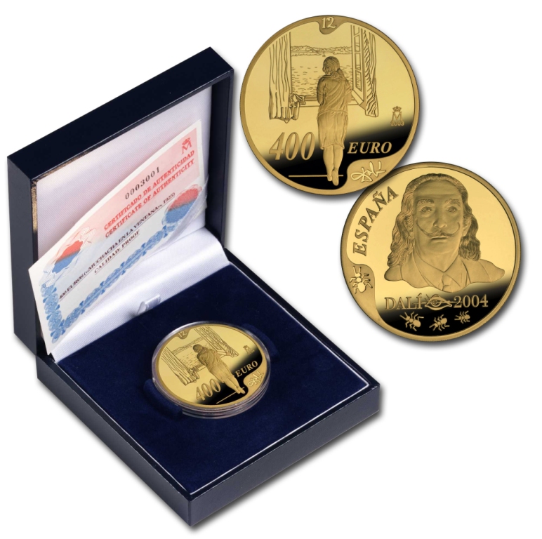 La moneda de 400 euros reproduce en su anverso un retrato de Salvador Dalí y en su reverso una interpretación del cuadro "Figura en una ventana" (1925).