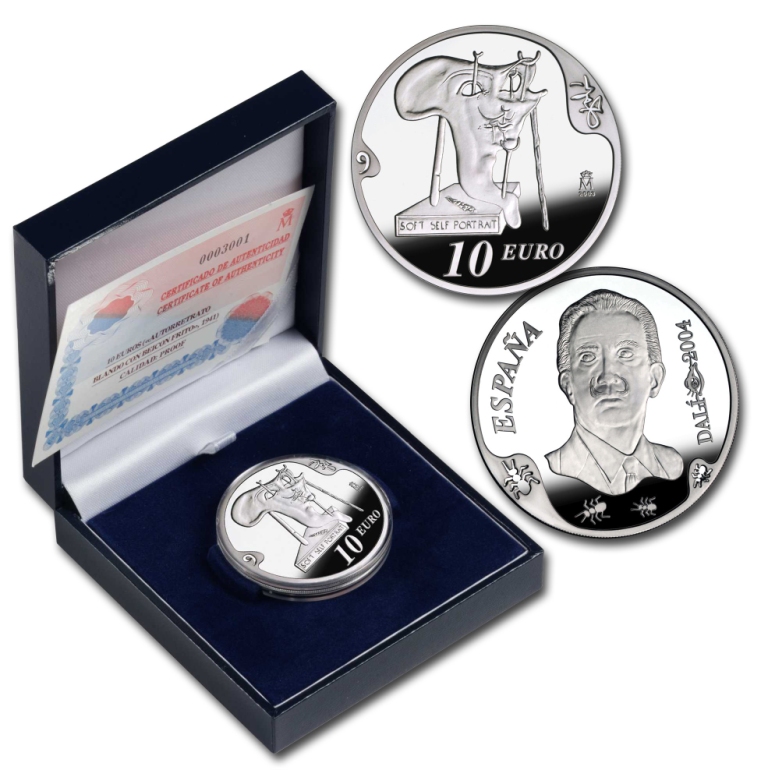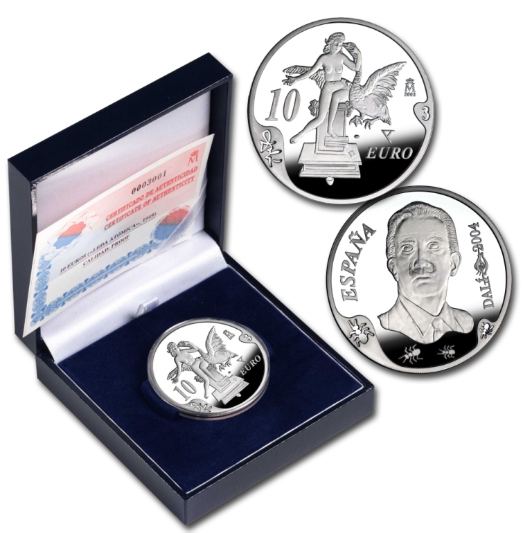 Premiada como la "moneda tecnológicamente más avanzada" por la XXIII Mint Directors' Conference (2004), esta moneda contiene en su anverso una interpretación de la obra "Un segundo antes del despertar" (1944), y en su reverso una interpretación de la obra "Figura rinoceróntica del Ilisos de Fidias" (1954).