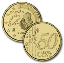 El anverso muestra el busto de Miguel de Cervantes. El reverso es el común a todos los países de la Zona Euro.