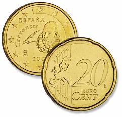 El anverso muestra el busto de Miguel de Cervantes. El reverso es el común a todos los países de la Zona Euro.