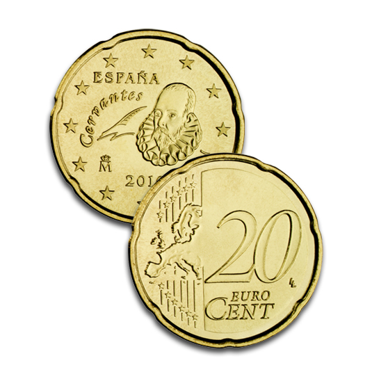 El anverso muestra el busto de Miguel de Cervantes. El reverso es el común a todos los países de la Zona Euro.