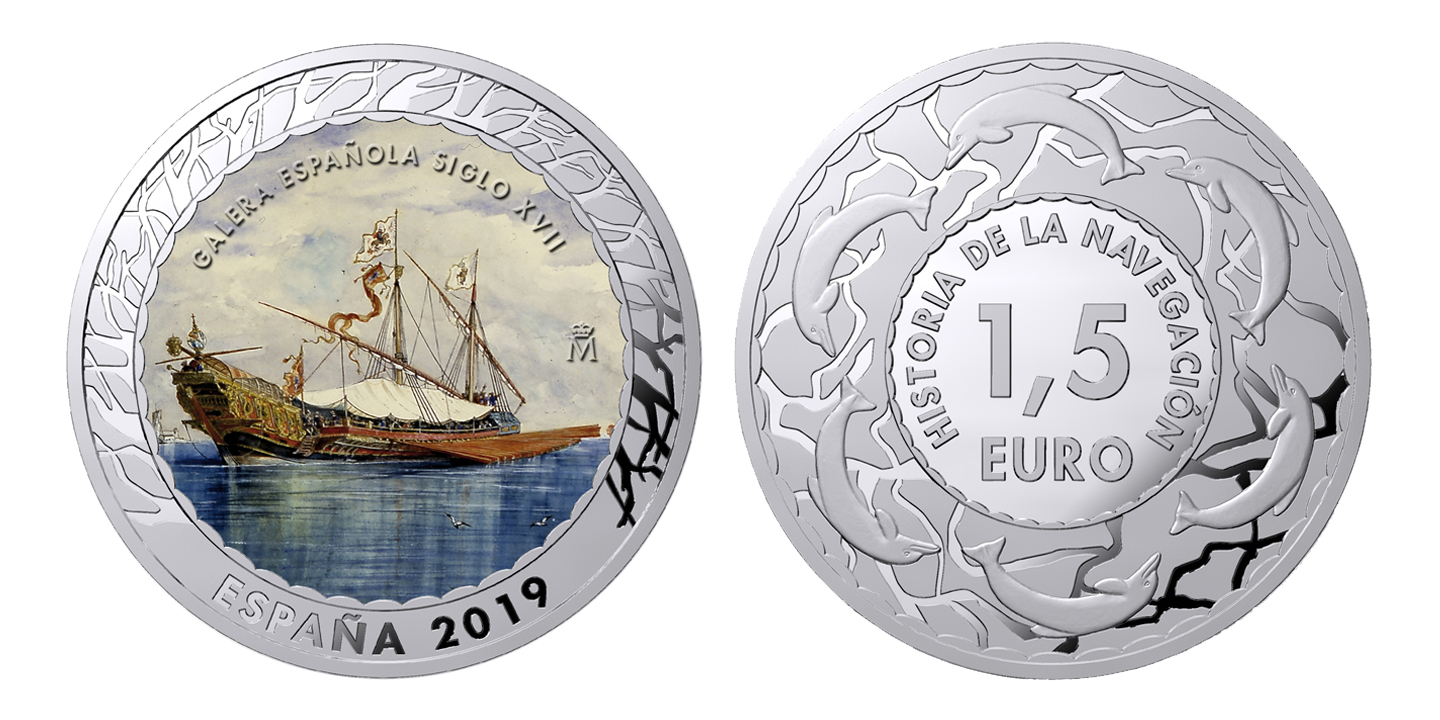 Esta moneda muestra en su anverso la imagen de la obra titulada "Renacimiento. Grandes galeras siglo XVII. Acuarela", que se conserva en el Museo Naval de Madrid.