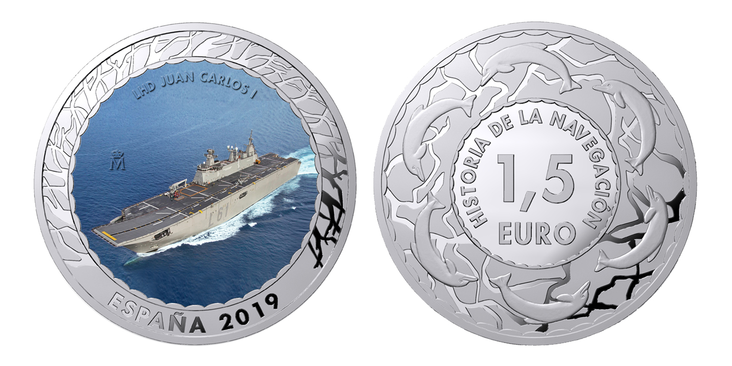 En esta moneda se representa una imagen del LHD Juan Carlos I, según fotografía propiedad de la Armada española.
