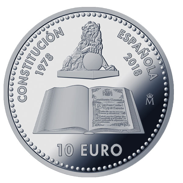 En el reverso, ocupando la parte central, se reproduce una imagen de un ejemplar abierto de la Constitución española. En la parte superior de la moneda, en sentido circular y en mayúsculas, la leyenda CONSTITUCIÓN ESPAÑOLA y las fechas 1978 y 2018, distribuidas en torno a la imagen de uno de los Leones esculpidos por Ponciano Ponzano, que custodia el Palacio del Congreso de los Diputados desde 1872.