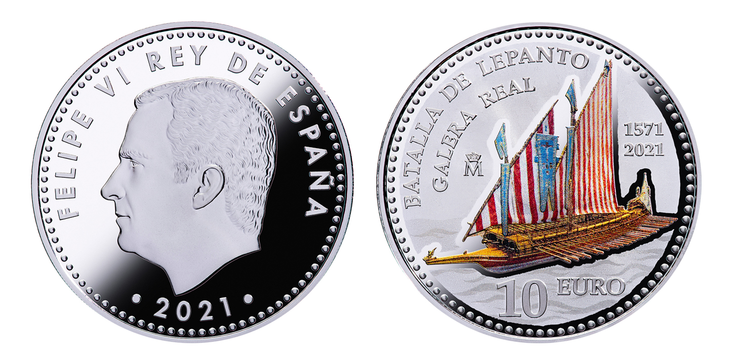 La pieza de 8 reales muestra en el anverso la efigie de S. M. Don Felipe VI; mientras que en el reverso aparece una imagen de la Galera comandada por Juan de Austria llamada "GALERA REAL" y que era el buque insignia de la Santa Liga. Construida en las Reales atarazanas de Barcelona en 1568 fue la mayor galera de su tiempo.