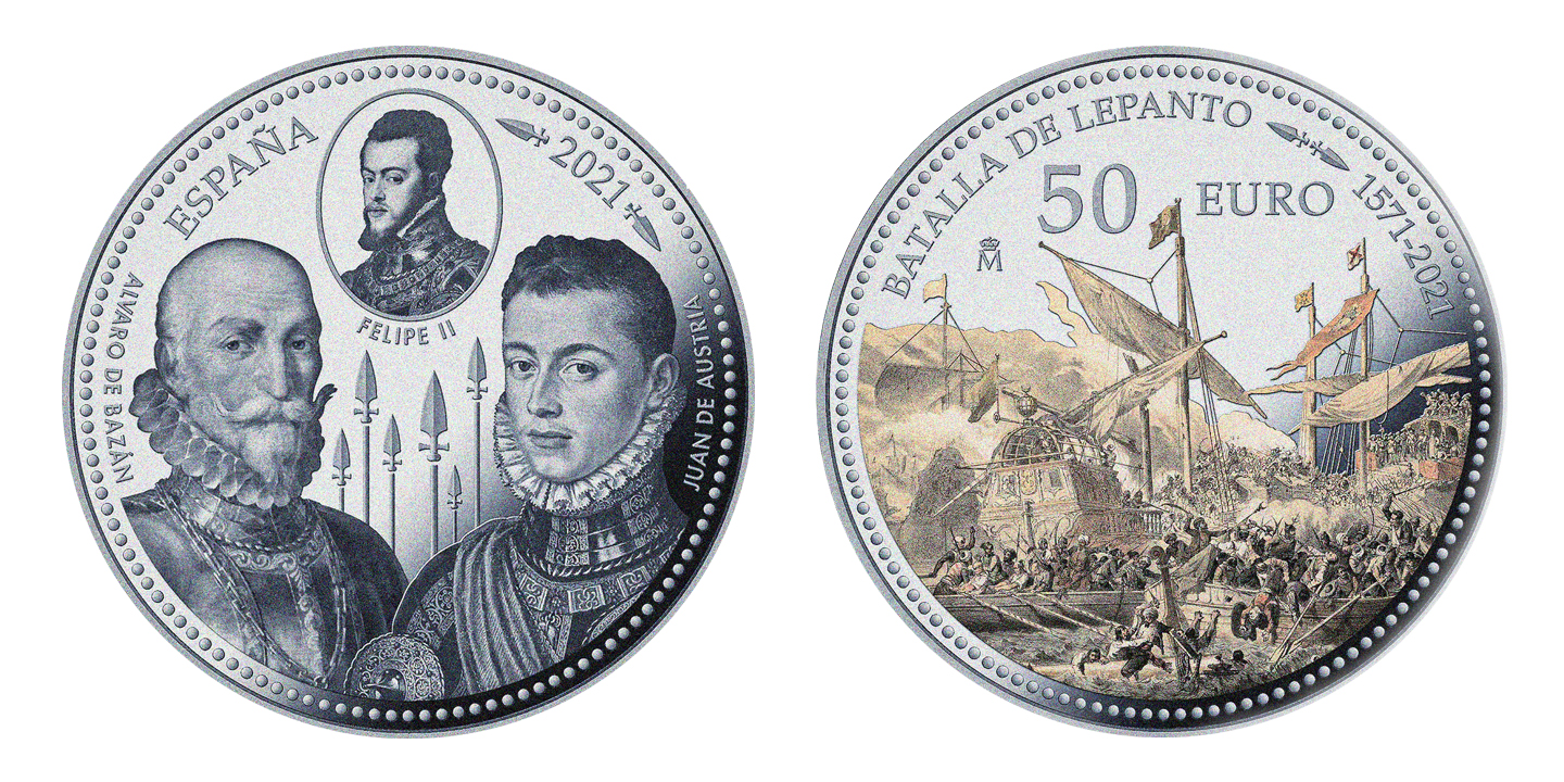 En el anverso del cincuentín se representa un momento de la batalla basada en una litografía realizada por Vicente Urrabieta, depositada en la Biblioteca Nacional de Madrid. En su reverso, aparece una imagen del rey español Felipe II, el comandante mayor de la Santa Liga, Don Juan de Austria, y el mando de los buques españoles Don Álvaro de Bazán. Entre ambos aparecen unas "picas", antigua arma muy utilizada por las tropas españolas.