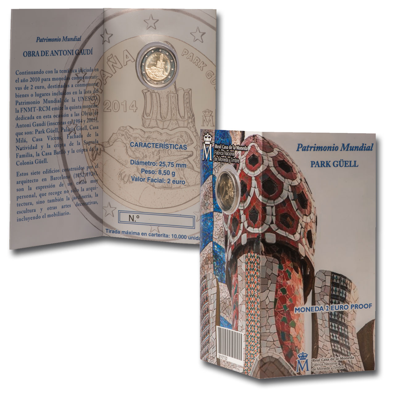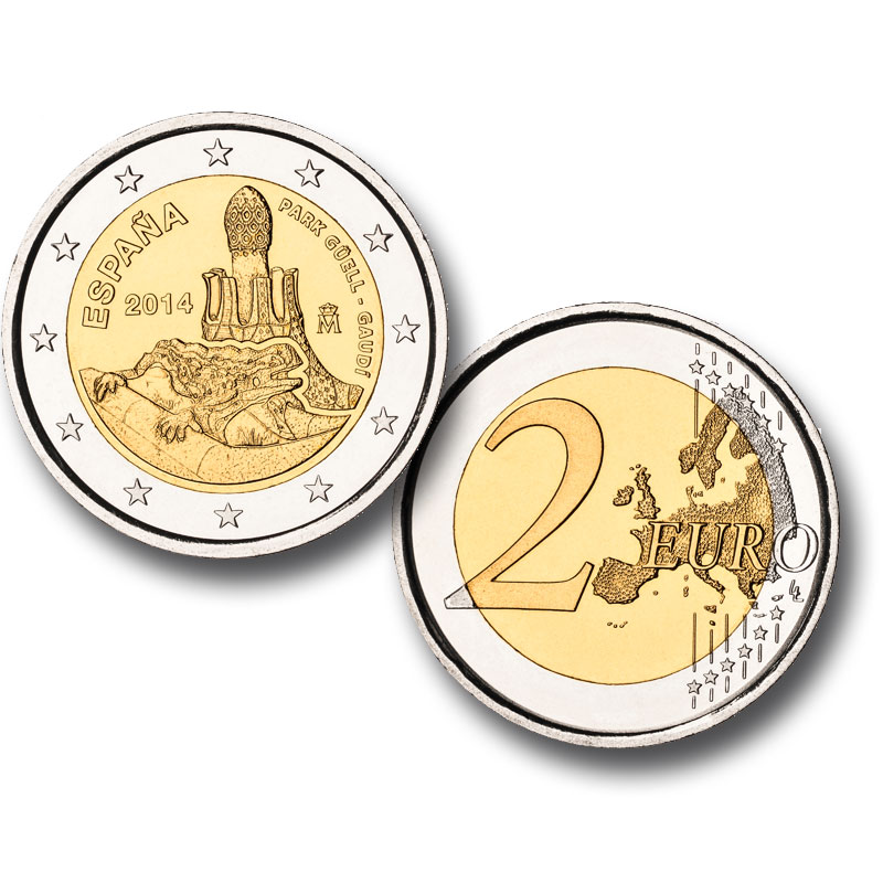 Durante 2014 se pone en circulación una moneda de 2 euros conmemorativa dedicada al Park Güell (Barcelona), espacio creado por el Arquitecto Antoni Gaudí a principios del siglo XX.