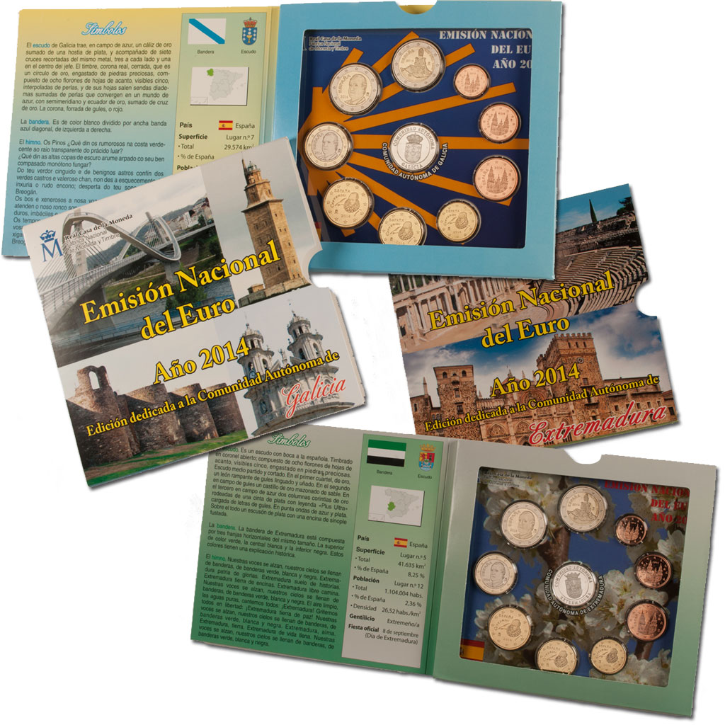 En esta edición, los blister con monedas de Euro no circuladas incluyen una medalla en plata de ley con el escudo de Extremadura o con el escudo de Galicia.