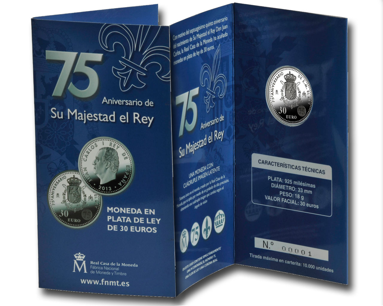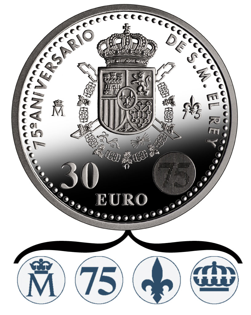 Esta moneda cuenta con la exclusiva CUÁDRUPLE IMAGEN LATENTE. Muestra en su reverso un círculo que, según el ángulo desde el que se mire, muestra una M coronada, la cifra 75, la representación de una flor de lis y una corona real. Además se reproduce el Escudo de Armas de Su Majestad el Rey.