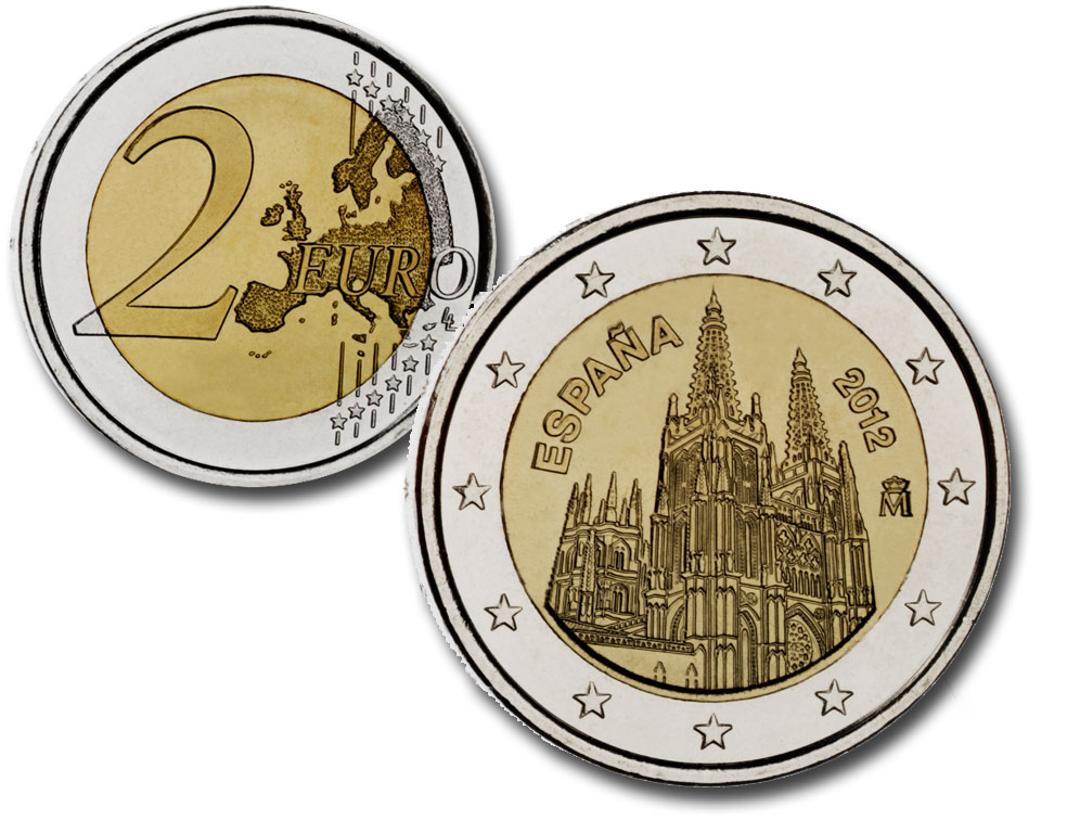 En 2012 se pone en circulación la sexta emisión de moneda de 2 euros conmemorativa, dedicada en esta ocasión a la Catedral de Burgos, uno de los más bellos monumentos del arte gótico que ha merecido el título de Patrimonio de la Humanidad en 1984.