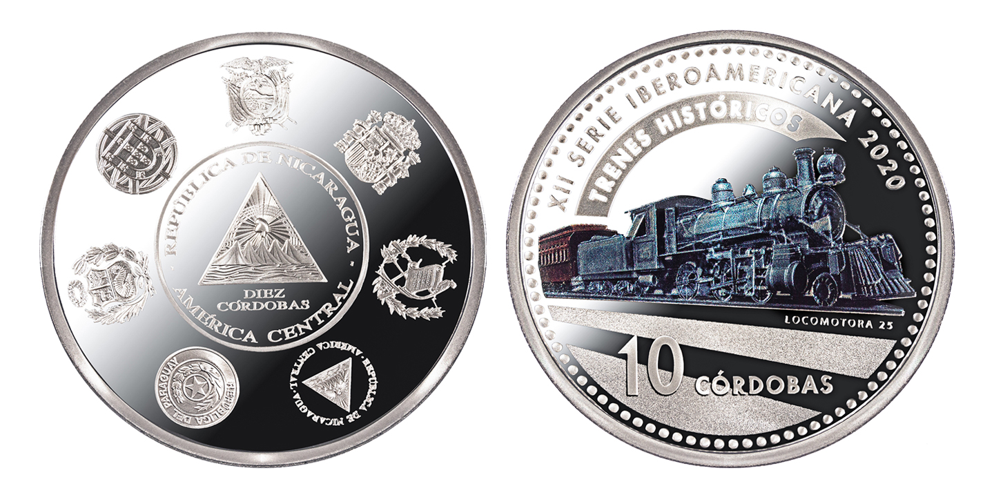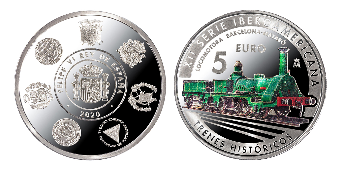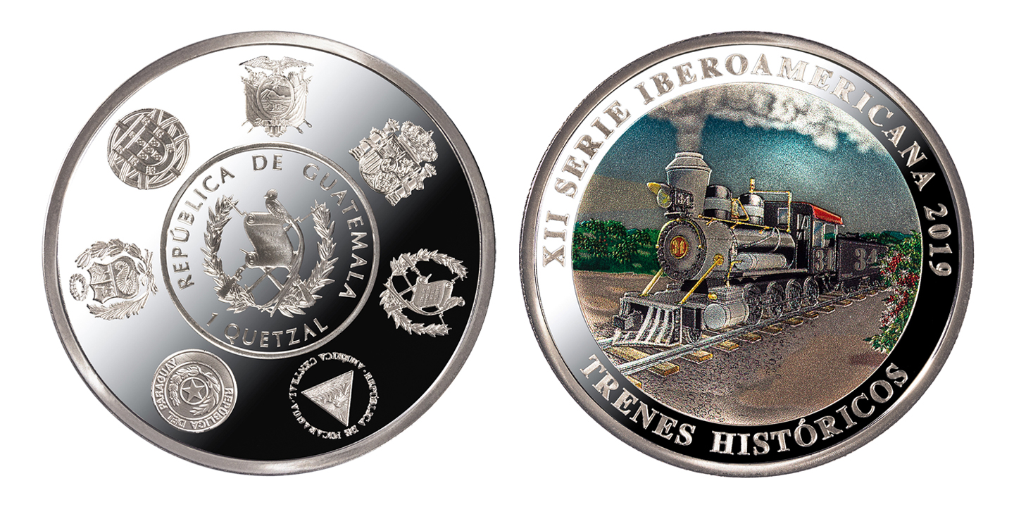 Esta XII Serie se emite bajo el tema TRENES HISTÓRICOS. Por ello, los reversos de cada una de las monedas presentan trenes clásicos de cada uno de estos países: la locomotora número 8 (Ecuador), la locomotora Mataró (España), la locomotora a vapor número 34 (Guatemala), la locomotora número 25 (Nicaragua), ferrocarril Carlos Antonio López (Paraguay), ferrocarril inglés que circulaba entre Lima y Callao (Perú) y el tren de la línea del Duero (Portugal).
