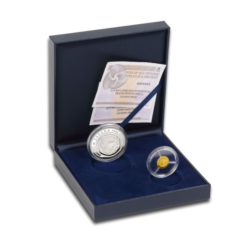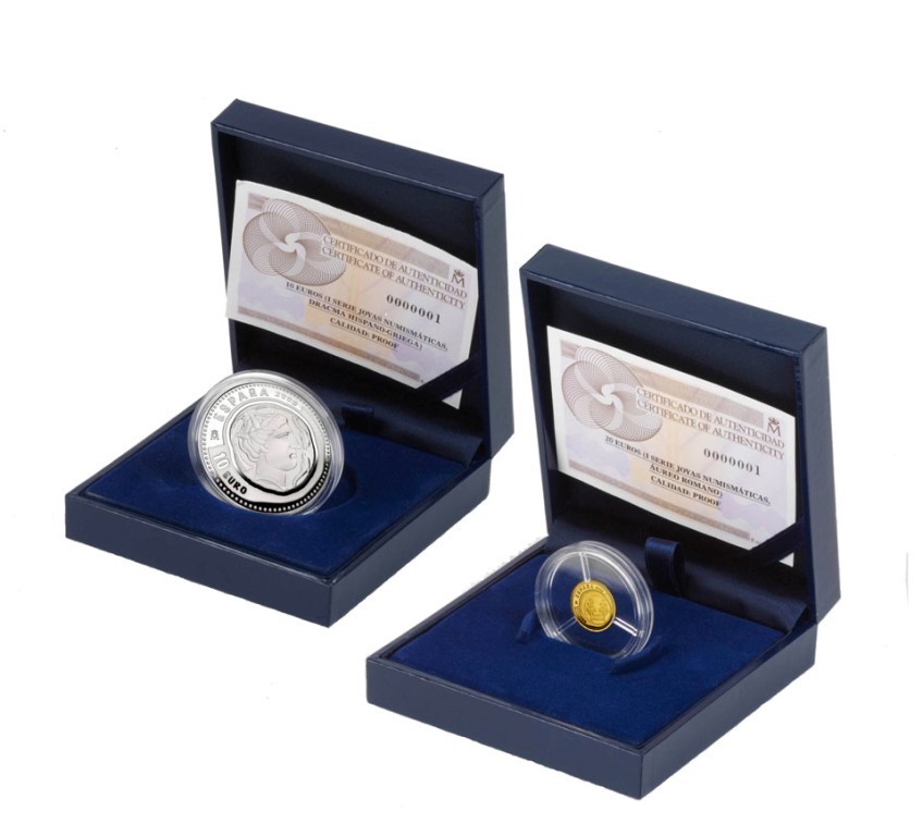 En esta primera edición, dedicada al áureo romano y al dracma griego, la Real Casa de la Moneda comienza acuñando una moneda de oro de 999 milésimas que, junto a la doble 4-reales de plata, forman esta nueva colección.