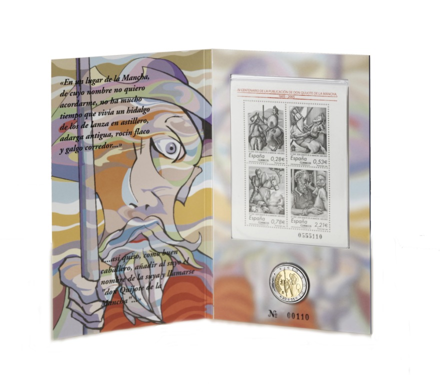 Esta edición especial, conmemorativa del IV Centenario de la primera edición de El Quijote, se presenta estuchada en una original carterita numerada y limitada a 25.000 unidades.Los cuatro sellos de la hoja bloque recogen distintas escenas de la obra, y se presentan junto con la moneda de 2 Euros conmemorativa de la misma efemérides.