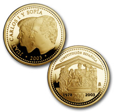 Acuñadas en calidad Proof y presentadas en estuche de joyería, las monedas de colección del XXV Aniversario de la Constitución Española, reproducen en su anverso las efigies superpuestas de SS. MM. los Reyes Don Juan Carlos y Doña Sofía.