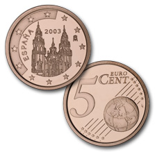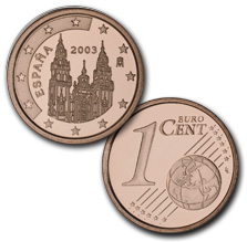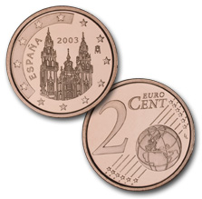 Reproduce en el anverso la fachada de la Catedral de Santiago de Compostela. El reverso es el común a todos los países de la Zona Euro.