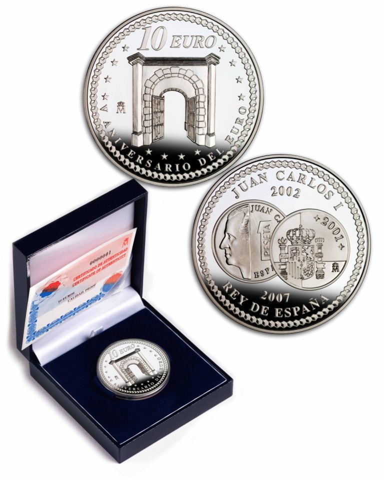The obverse of this coin (common to all three coins with the 10-Euro face value) reproduces in its central area the obverse and the reverse of a 1-peseta coin from 2001, this being the last release made in the peseta denominations.