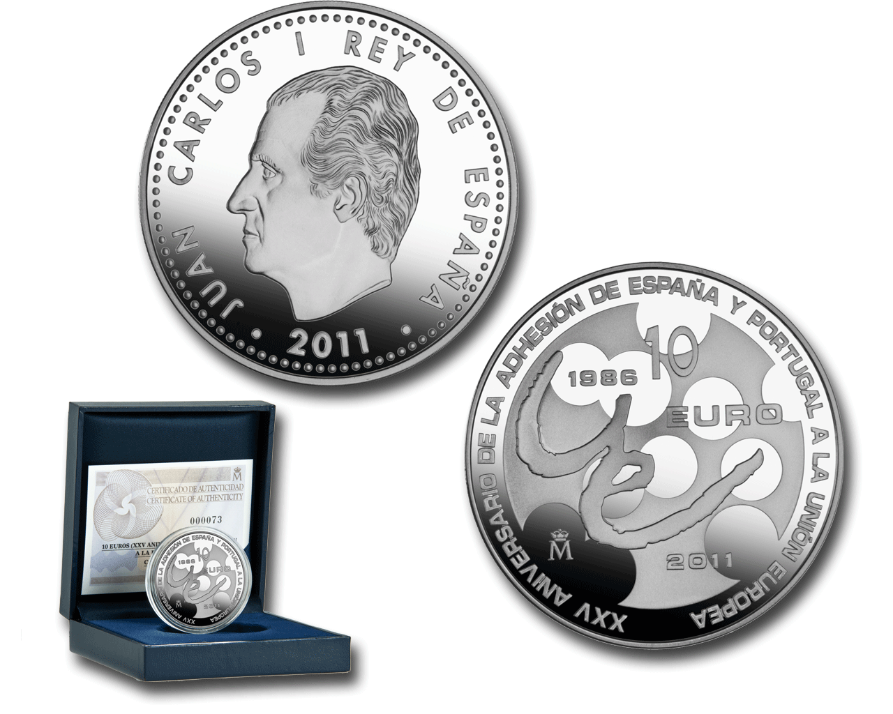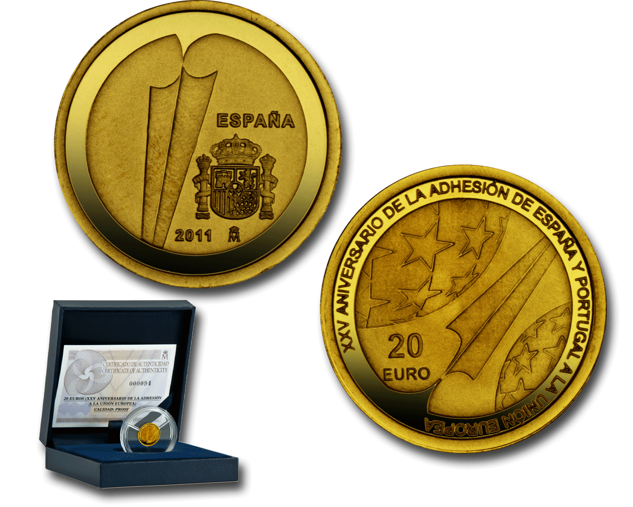 On the occasion of the 25th Anniversary of the Accession of Spain and Portugal to the European Union (1986-2011), the mints of these two countries have prepared a commemorative issue, consisting in both cases of one gold and one sterling silver coin minted in proof quality.