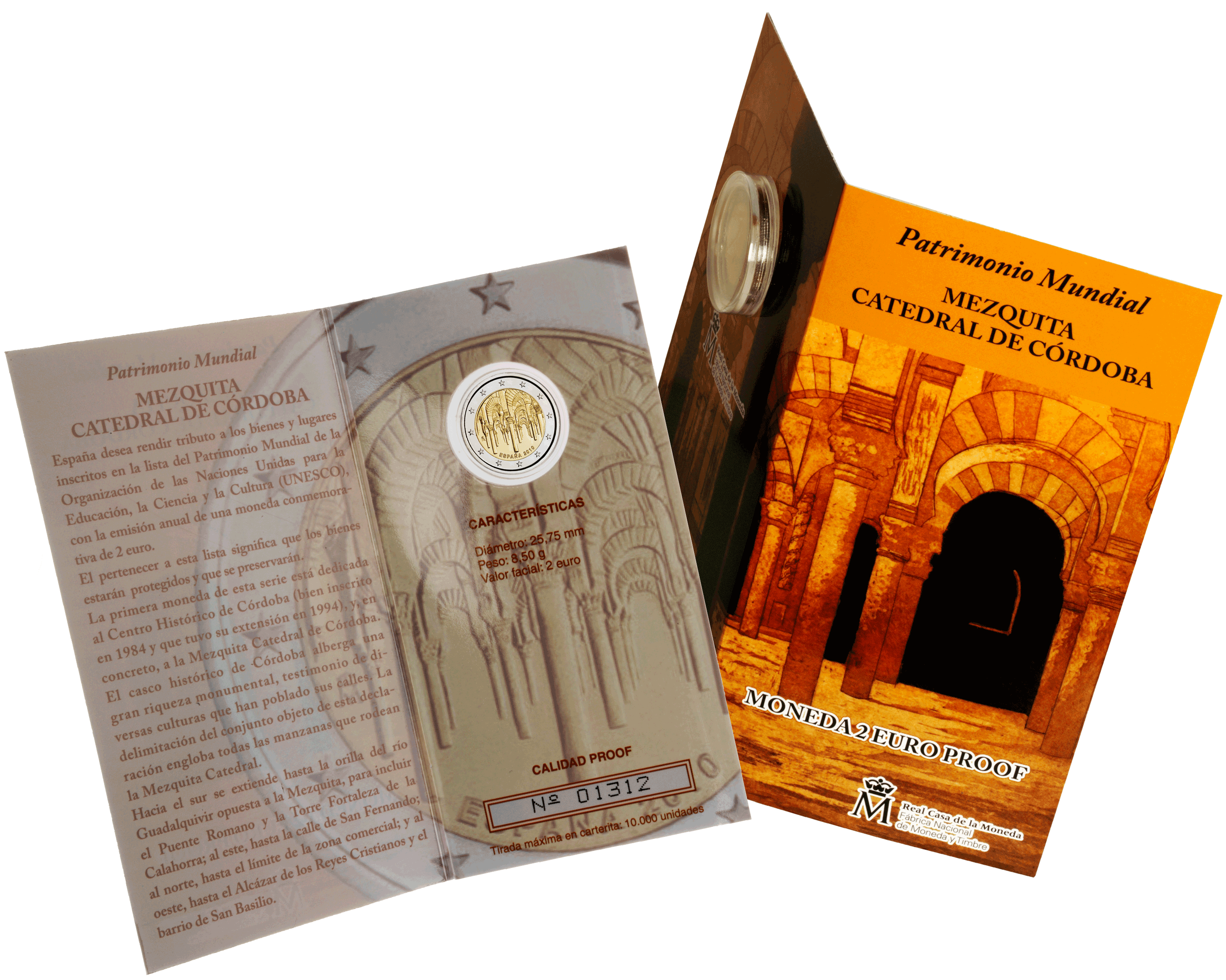 España desea rendir tributo a los bienes y lugares inscritos en la lista del Patrimonio Mundial de la UNESCO, con la emisión anual de una moneda conmemorativa de 2 euro. El pertenecer a esta lista significa que los bienes estarán protegidos y que se preservarán. La primera moneda de esta serie emitida en el año 2010, está dedicada al Centro Histórico de Córdoba, y en concreto, a la Mezquita Catedral de Córdoba.