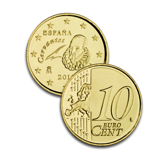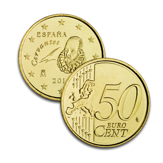 El anverso muestra el busto de Miguel de Cervantes. El reverso es el común a todos los países de la Zona Euro.