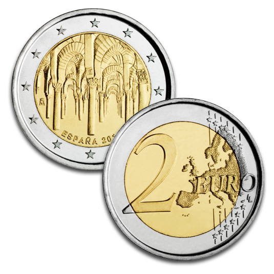 La cuarta emisión de moneda de 2 euros muestra en su reverso una imagen del interior de la Mezquita Catedral de Córdoba, uno de los más antiguos y mejores ejemplos del arte islámico en Europa