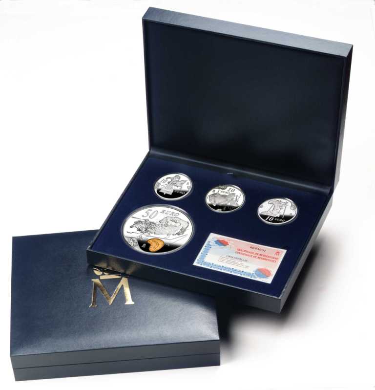 Magníficamente acuñadas en calidad proof, reproducen algunas de las obras más características del genial artista. Las cinco monedas se presentan encapsuladas (para la perfecta conservación de su tallado y su brillo) e insertadas en un elegante estuche de joyería, llevando todas ellas su correspondiente certificado de autenticidad emitido por la FNMT-RCM.