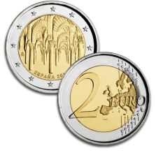 La cuarta emisión de moneda de 2 euros muestra en su reverso una imagen del interior de la Mezquita Catedral de Córdoba, uno de los más antiguos y mejores ejemplos del arte islámico en Europa