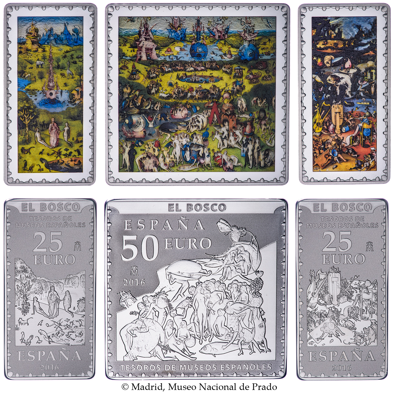 La Real Casa de la Moneda se suma a la conmemoración con la emisión de una colección única desarrollada en estrecha colaboración con el Museo del Prado. Está compuesta de tres monedas de plata dedicadas al tríptico del "Jardín de las Delicias", y una moneda de oro dedicada a las obras "El carro de heno" y "Las tentaciones de San Antonio".