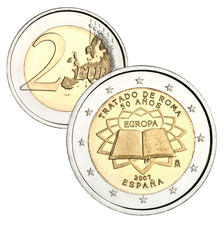 La segunda emisión de moneda de 2 euros conmemora el 50 Aniversario del Tratado de Roma, firmado el 25 de marzo de 1957 y por el que se originó la Unión Europea. La cara nacional lleva un diseño común para todos los Estados miembros de la zona euro.